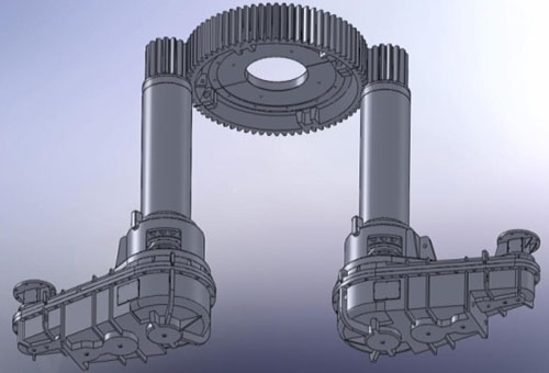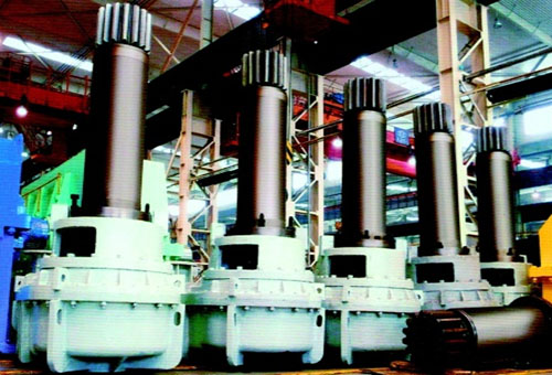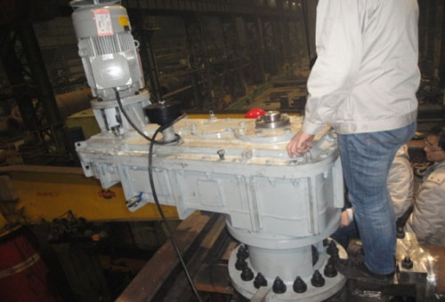 傳動(dòng)裝置由減速機(jī)、輸出齒輪軸、偏心套組件及填料環(huán)組件等幾部分組成。減速機(jī)由變頻調(diào)速電機(jī)經(jīng)限力聯(lián)軸器直接驅(qū)動(dòng),通過5級(jí)硬齒面圓柱齒輪傳動(dòng),由內(nèi)花鍵軸傳遞給輸出齒輪軸。偏心套、滑動(dòng)軸套和填料環(huán)裝配后經(jīng)聯(lián)結(jié)法蘭和減速機(jī)一起把合在爐體上。可通過調(diào)整減速機(jī)和偏心套的相對(duì)把合位置來調(diào)整開式齒輪傳動(dòng)的中心距以補(bǔ)償由于高溫產(chǎn)生的形變