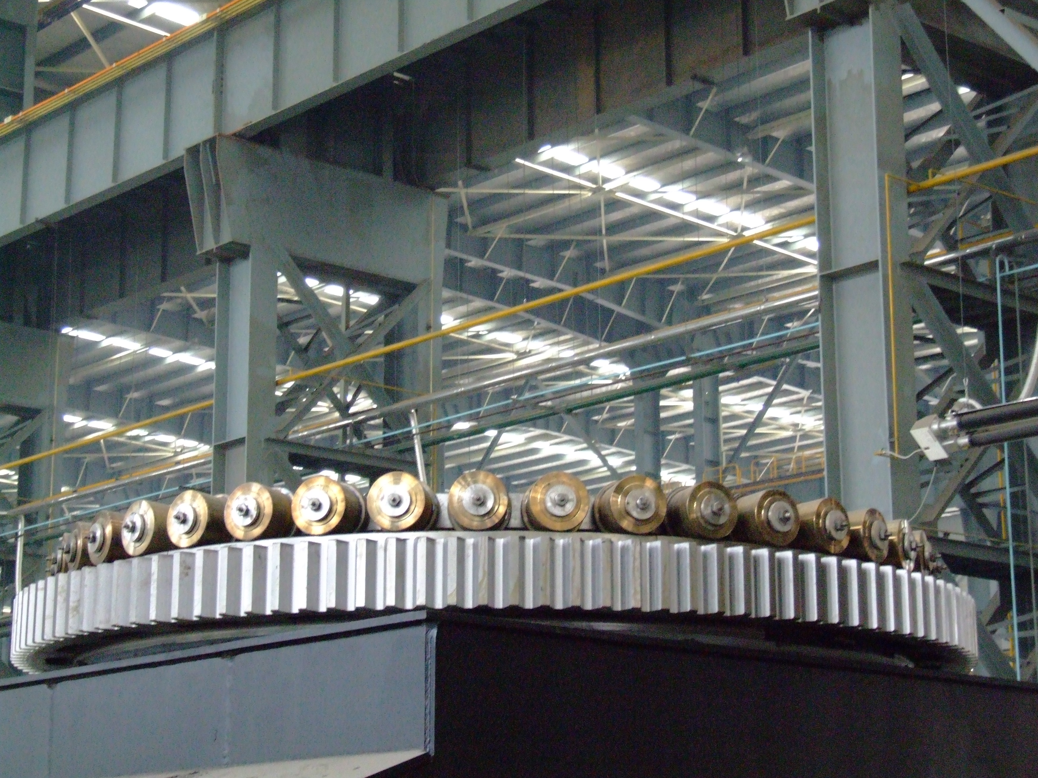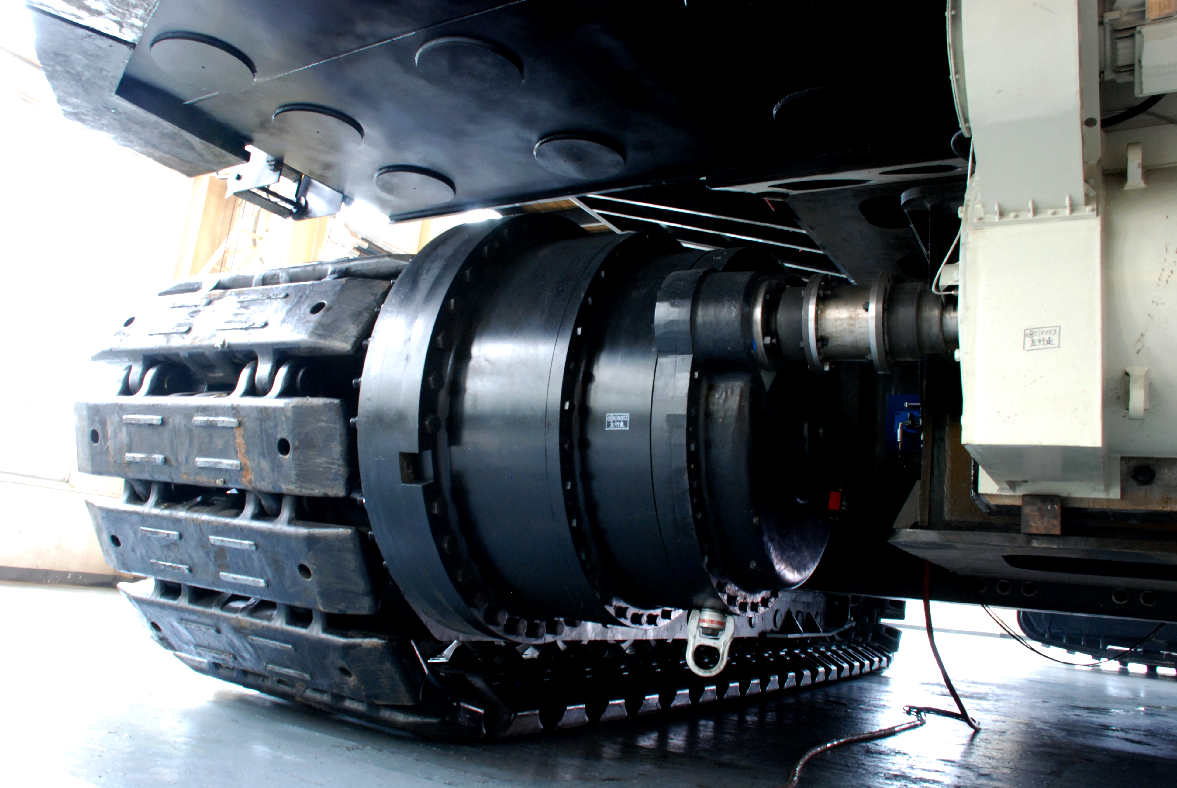 行走減速機由電機驅(qū)動挖掘機的走行。減速機輸入軸為實心花鍵軸,與電機通過聯(lián)軸器聯(lián)接,輸出軸為空心花鍵軸,與履帶驅(qū)動軸聯(lián)接;回轉(zhuǎn)減速機安裝在回轉(zhuǎn)平臺上,為回轉(zhuǎn)機構(gòu)的一級減速機。電機驅(qū)動減速機,減速機輸出空心軸與回轉(zhuǎn)立軸聯(lián)接,回轉(zhuǎn)立軸齒輪與回轉(zhuǎn)大齒圈嚙合,實現(xiàn)挖掘機的回轉(zhuǎn)運動;提升減速機為挖掘機提升機構(gòu)的主傳動設備,用于驅(qū)動提升卷筒。與回轉(zhuǎn)平臺的聯(lián)接型式為鉸接聯(lián)接,楔塊定位,相對獨立于回轉(zhuǎn)平臺之外,...