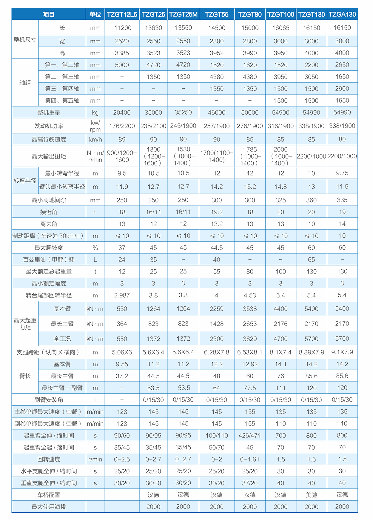 TZGT系列汽車起重機和TZGA系列全地面起重機,產(chǎn)品涵蓋12-130t,整機性能行業(yè)領(lǐng)先