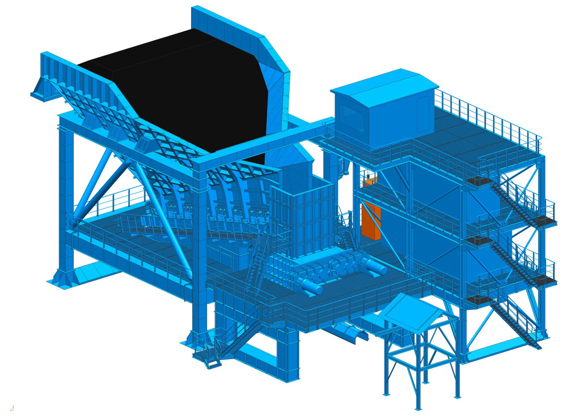 雙齒輥半移動破碎站用于千萬噸級以上大型露天礦原煤及剝離物的初級破碎,其開采工藝一般為單斗挖掘機(jī)—運(yùn)輸汽車—半移動破碎站—膠帶機(jī)。利用汽車運(yùn)輸?shù)撵`活性,縮短了汽車運(yùn)距,又發(fā)揮了帶式輸送適用于長距離運(yùn)輸、生產(chǎn)率高、成本低、維護(hù)量小、安全可靠的特點(diǎn),同時可隨開采推進(jìn)定期遷移,機(jī)動靈活。