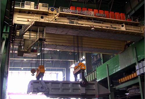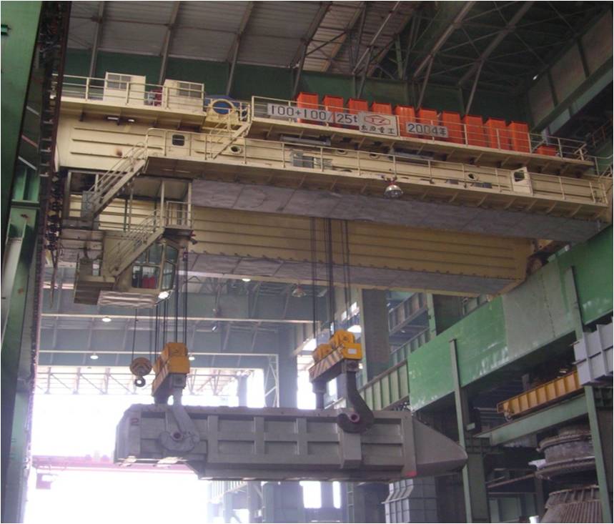 轉(zhuǎn)爐煉鋼過程中配置料箱起重機(jī),主要用于添加冷料作業(yè)。電爐加料起重機(jī)主要用于向電爐加廢鋼,與鑄造起重機(jī)主要區(qū)別在于主起升機(jī)構(gòu)可以不考慮單機(jī)工作的工況
