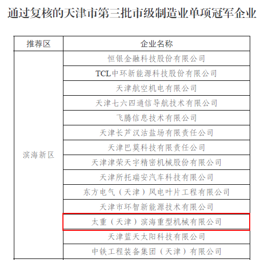 近日,天津市工業(yè)和信息化局正式公布了通過復(fù)核的第三批市級(jí)制造業(yè)單項(xiàng)冠軍企業(yè)名單。憑借持續(xù)的技術(shù)創(chuàng)新和行業(yè)優(yōu)勢(shì)地位,太重濱海公司成功通過復(fù)核,再次獲“單項(xiàng)冠軍”稱號(hào)。