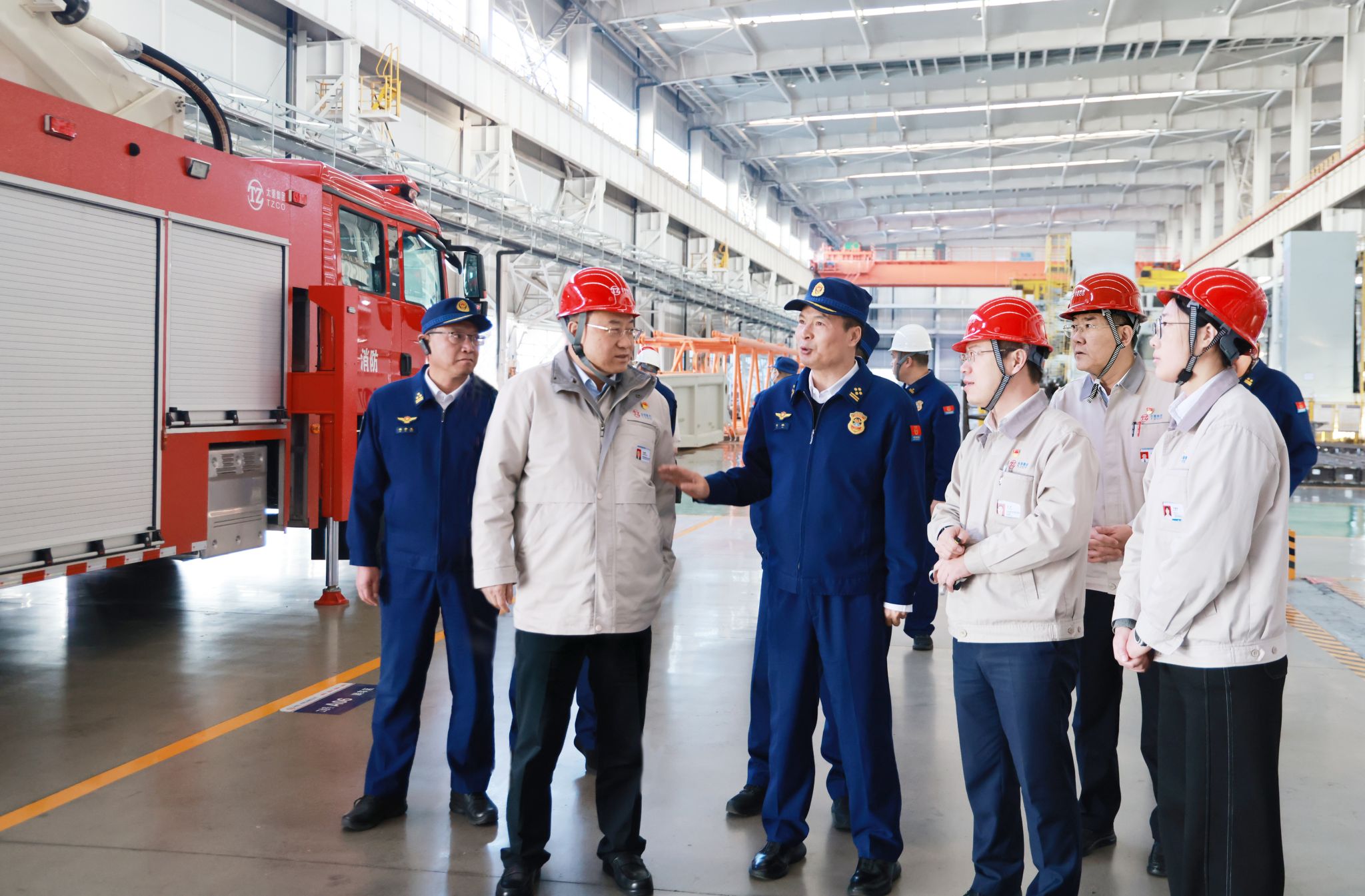 在韓珍堂的陪同下,客人一行走進太重智能高端裝備產(chǎn)業(yè)園區(qū)的生產(chǎn)車間,實地考察登高平臺消防車、泡沫消防車、水罐消防車、舉高噴射消防車等裝備以及礦山、起重裝備。韓珍堂表示,消防安全至關(guān)重要,而高性能、高可靠性的消防裝備就是應(yīng)急救援的“利器”。太重心懷“國之大者”,將高端裝備制造優(yōu)勢與國家應(yīng)急體系建設(shè)緊密結(jié)合,已構(gòu)建起全品類消防救援裝備體系。其中,太重自主研發(fā)設(shè)計的91米登高平臺消防車刷新了行業(yè)紀錄,成為目前全球最高的五軸登高平臺消防車。消防裝備承載的是生命的重托。太重愿與山西省消防救援總隊攜手,精準對接需求,拓展消防品類,加大新型裝備研發(fā)力度,以性能更卓越、可靠性更高的系列化裝備,為我省消防安全事業(yè)作出更大貢獻。