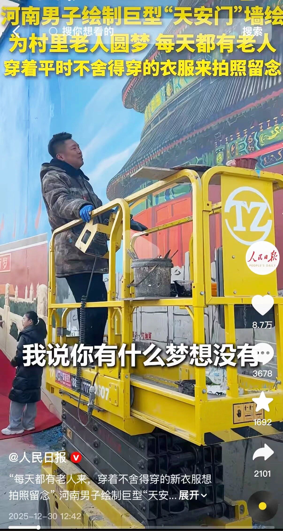青年畫家吳承言用手中的畫筆,把北京的標志性景觀“搬”到了家鄉(xiāng)的墻面上,為村里沒出過遠門的老人圓了“首都夢”。視頻發(fā)布后迅速登上熱搜,人民日報、央廣網(wǎng)等全網(wǎng)媒體紛紛點贊。而讓這份浪漫得以落地的,正是太重剪叉車的默默助力。