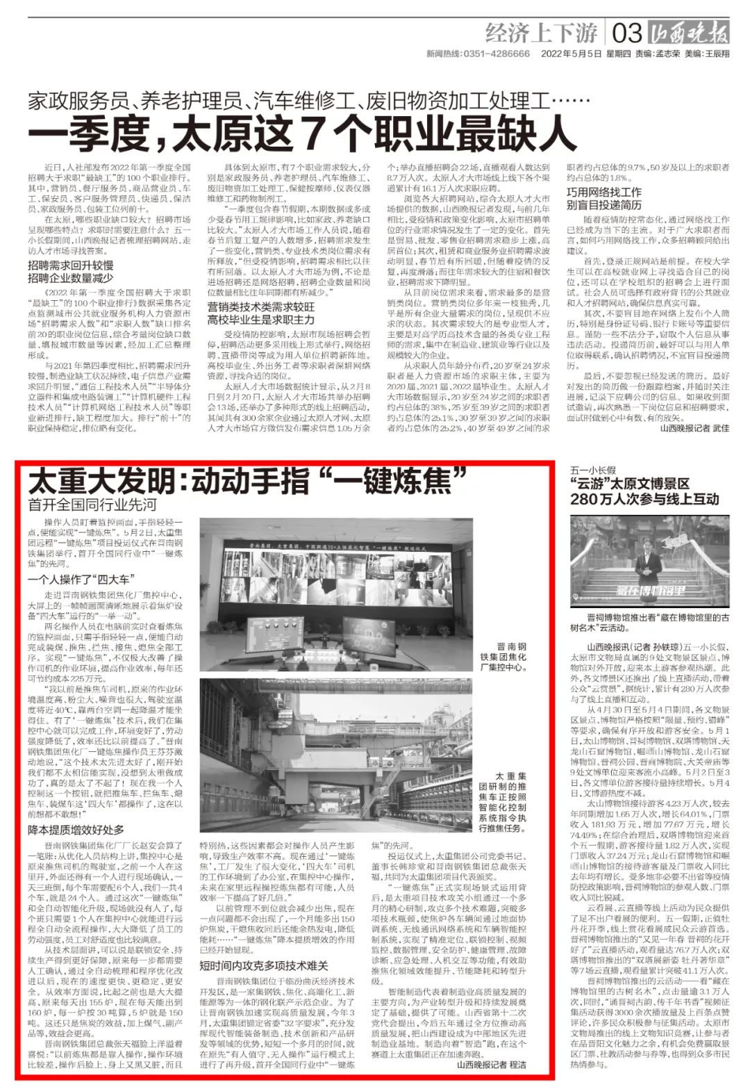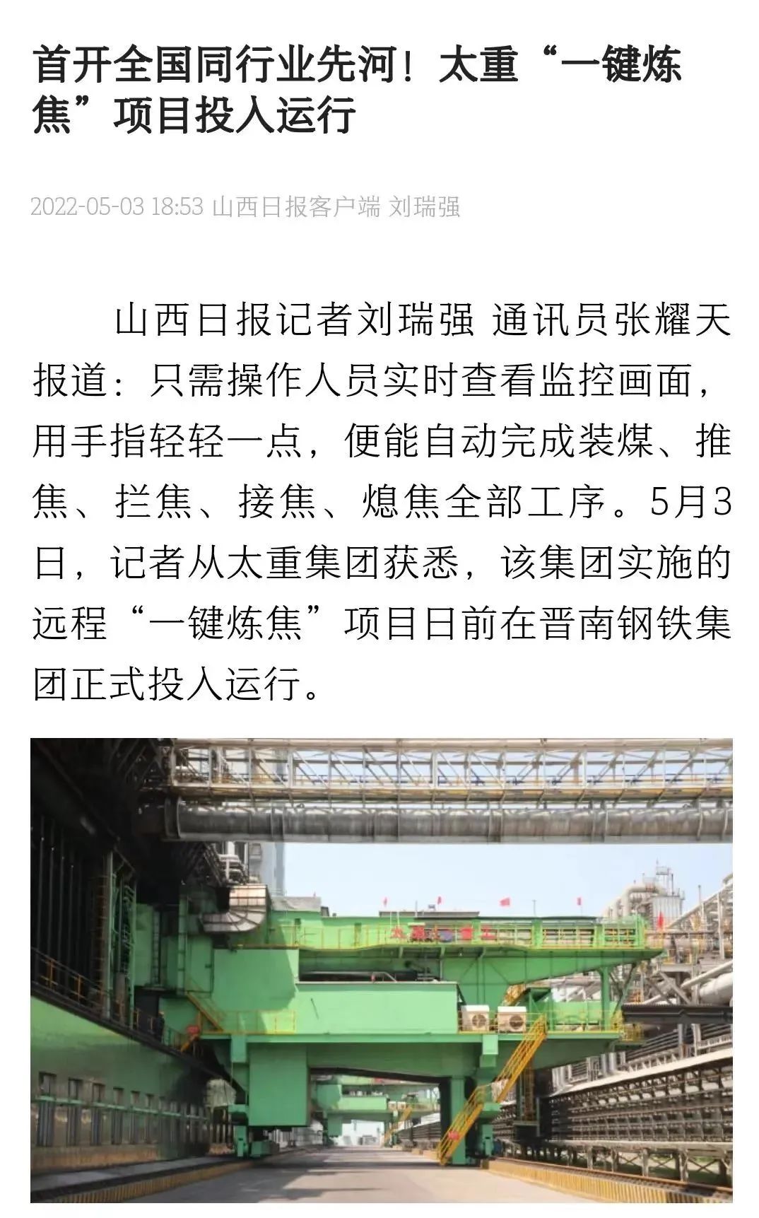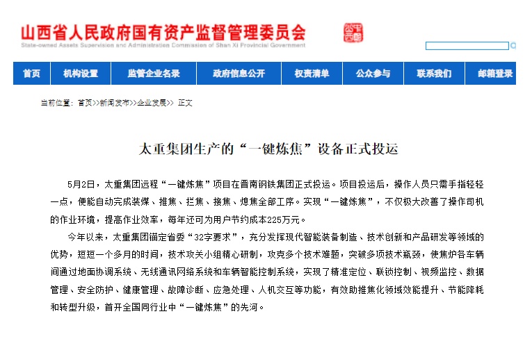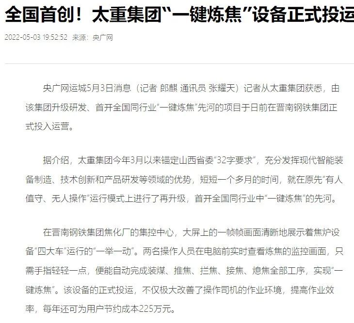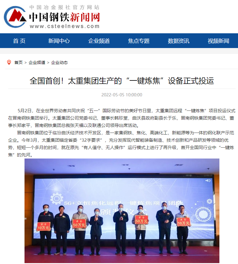 央廣網(wǎng)、中國鋼鐵新聞網(wǎng)、騰訊以《全國首創(chuàng)!太重集團(tuán)“一鍵煉焦”設(shè)備正式投運(yùn)》為題,聚焦太重集團(tuán)以科技創(chuàng)新激發(fā)“智造”新活力為出發(fā)點(diǎn),全面展示“智能+5G”在“一鍵煉焦”上的應(yīng)用,助力焦化領(lǐng)域效能提升、節(jié)能降耗和轉(zhuǎn)型升級(jí)。中國經(jīng)濟(jì)網(wǎng)、網(wǎng)易、山西國資以《太重集團(tuán)“一鍵煉焦”設(shè)備正式投運(yùn)》為題,報(bào)道太重集團(tuán)“一鍵煉焦”項(xiàng)目正式開啟智能煉焦新時(shí)代,填補(bǔ)技術(shù)空白,開創(chuàng)國內(nèi)焦化行業(yè)先河。搜狐網(wǎng)以《環(huán)境好了,效率高了,收益漲了!太重首創(chuàng)“一鍵煉焦”項(xiàng)目投運(yùn)》為題,重點(diǎn)展示了太重集團(tuán)“一鍵煉焦”項(xiàng)目成果,實(shí)現(xiàn)智能綠色工廠轉(zhuǎn)型再升級(jí)。山西日?qǐng)?bào)、山西晚報(bào)、太原日?qǐng)?bào)分別以《首開全國同行業(yè)先河!太重“一鍵煉焦”項(xiàng)目投入運(yùn)行》《太重大發(fā)明:動(dòng)動(dòng)手指“一鍵煉焦”》《太重首創(chuàng)“一鍵煉焦”項(xiàng)目投運(yùn)》為題,聚焦太重“智造”再提速,充分展現(xiàn)公司以“三性五化”為新產(chǎn)品開發(fā)目標(biāo),助力國家實(shí)現(xiàn)“雙碳”目標(biāo)。
