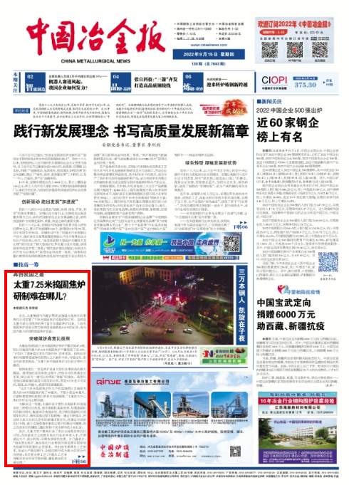 9月15日,中國冶金報頭版以《太重7.25米搗固焦爐研制難在哪兒?》為題,重點報道太重集團聚焦“雙碳”目標,充分發(fā)揮高端裝備制造領域的豐富經驗和技術優(yōu)勢,成功研制7.25米搗固焦爐設備,打破我國此前最高6.8米的紀錄,成為國內最大的智能搗固焦爐設備。