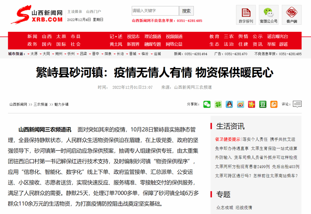 面對突如其來的疫情,10月28日繁峙縣實施靜態(tài)管理,全縣保持靜默狀態(tài),人民群眾生活物資保供迫在眉睫,在上級黨委、政府的堅強領(lǐng)導(dǎo)下,砂河鎮(zhèn)第一時間啟動應(yīng)急保供預(yù)案,抽調(diào)專人組建保供專班,由太重集團駐西沿口村第一書記解保紅進行技術(shù)支持,及時編制砂河鎮(zhèn)“物資保供程序”,應(yīng)用“信息化、智能化、數(shù)字化”線上下單、政府監(jiān)管接單、匯總派單、公安運送、小區(qū)接收、志愿者送貨,實現(xiàn)快速反應(yīng)、服務(wù)精準(zhǔn)、零接觸交付的保供服務(wù),滿足了人民群眾的需要。靜默25天,處理訂單7000多單,保障了砂河鎮(zhèn)全域6萬多群眾110余萬元的生活物資,為打贏疫情防控阻擊戰(zhàn)奠定堅實基礎(chǔ)。