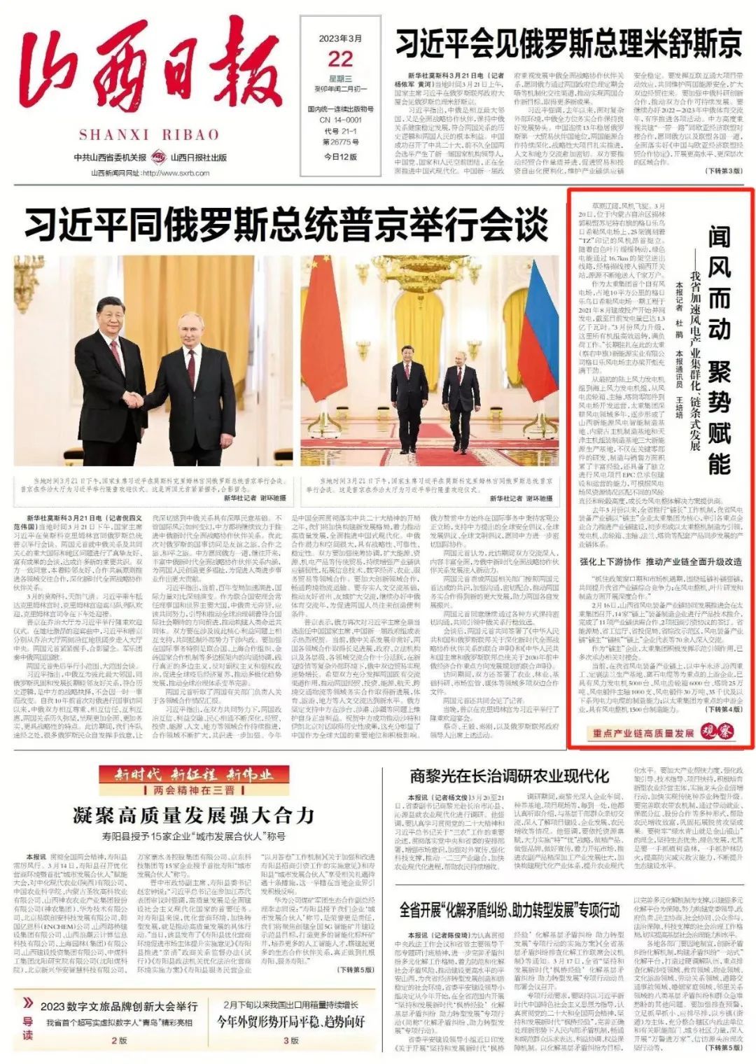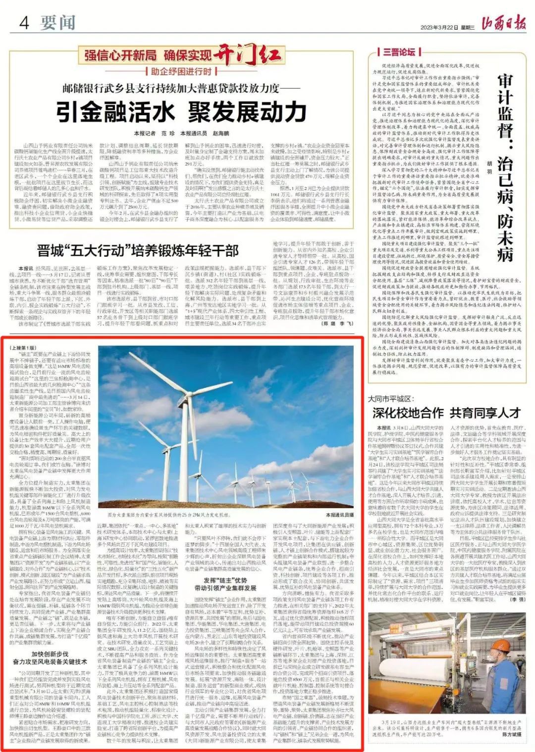 今天,山西日報頭版“重點產業(yè)鏈高質量發(fā)展觀察”專欄,以“我省風電產業(yè)集群化、鏈條式發(fā)展”為題,報道了太重集團聞風而動、聚勢賦能,發(fā)展壯大風電產業(yè)鏈、創(chuàng)新鏈、價值鏈的生動實踐。