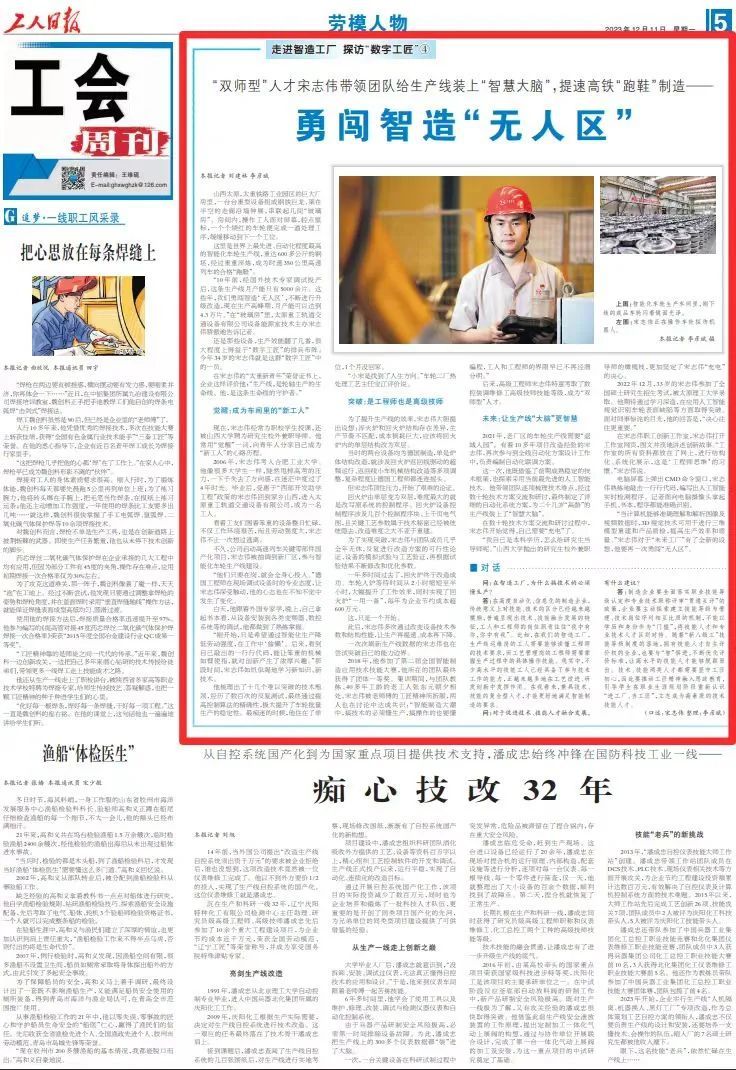 近日,《工人日?qǐng)?bào)》對(duì)太重軌道公司設(shè)備能源室技術(shù)主辦宋志偉勇于創(chuàng)新、勇闖智造“無人區(qū)”,為高鐵打造合格“跑鞋”的先進(jìn)事跡進(jìn)行了聚焦報(bào)道。從覺醒成為一名新時(shí)代的工人到“雙師型”人才的突破,再到勇闖“無人區(qū)”,為生產(chǎn)線裝上了“智慧大腦”,宋志偉不斷攀登科研技術(shù)高峰,攻克多項(xiàng)科技創(chuàng)新難點(diǎn),不斷用熱情和力量踐行著強(qiáng)國(guó)有我的青年擔(dān)當(dāng)。