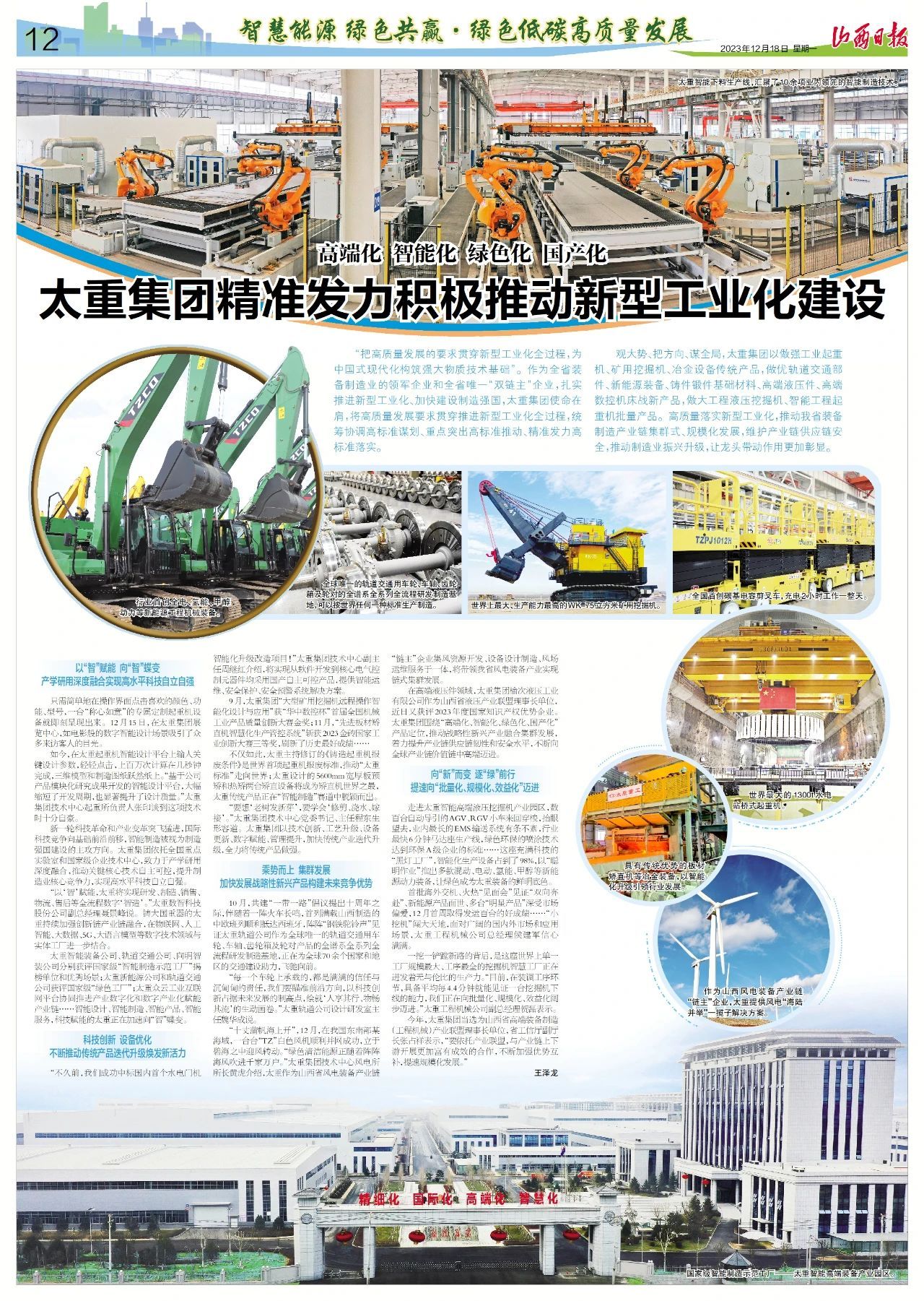 今日,山西日報整版刊發(fā)《高端化 智能化 綠色化 國產(chǎn)化 太重集團(tuán)精準(zhǔn)發(fā)力積極推動新型工業(yè)化建設(shè)》文章,從產(chǎn)學(xué)研用深度融合、傳統(tǒng)產(chǎn)品迭代升級、加快發(fā)展戰(zhàn)略性新興產(chǎn)品、打造綠色批量裝備等方面,詳細(xì)報道太重高質(zhì)量落實新型工業(yè)化的生動實踐,講述公司作為全省唯一“雙鏈主”企業(yè),持續(xù)推動我省裝備制造產(chǎn)業(yè)鏈集群式、規(guī)模化發(fā)展的務(wù)實之舉。