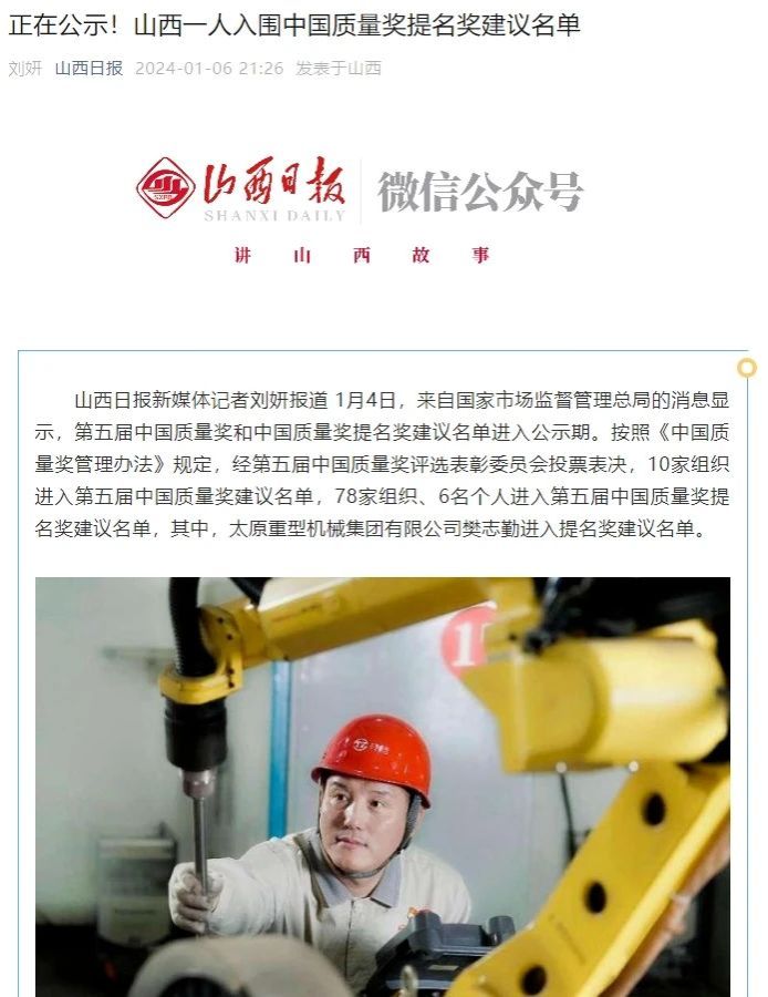 1月4日,來自國家市場監(jiān)督管理總局的消息顯示,第五屆中國質量獎和中國質量獎提名獎建議名單進入公示期。按照《中國質量獎管理辦法》規(guī)定,經(jīng)第五屆中國質量獎評選表彰委員會投票表決,10家組織進入第五屆中國質量獎建議名單,78家組織、6名個人進入第五屆中國質量獎提名獎建議名單,其中,太原重型機械集團有限公司樊志勤進入提名獎建議名單。