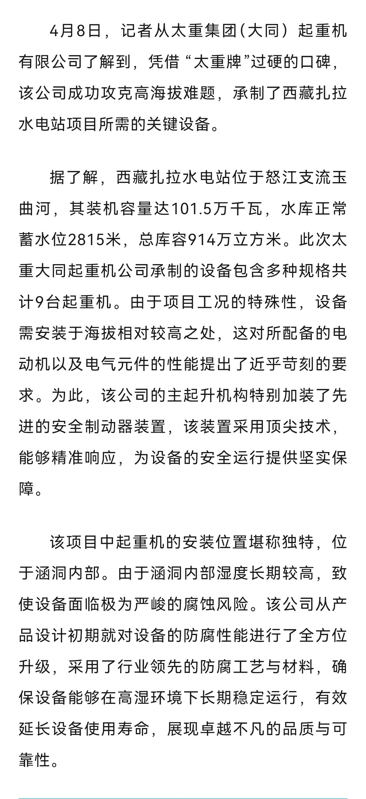 喜訊傳來,振奮人心!太重集團(tuán)(大同)起重機(jī)有限公司佳績(jī)不斷,再獲矚目。此前助力攀枝花項(xiàng)目,憑借出色表現(xiàn)受到媒體關(guān)注。4月9日,《大同日?qǐng)?bào)》頭版再度聚焦報(bào)道,太重集團(tuán)(大同)起重機(jī)有限公司攻克高海拔難題,成功承制了西藏扎拉水電站項(xiàng)目關(guān)鍵設(shè)備承制任務(wù)。