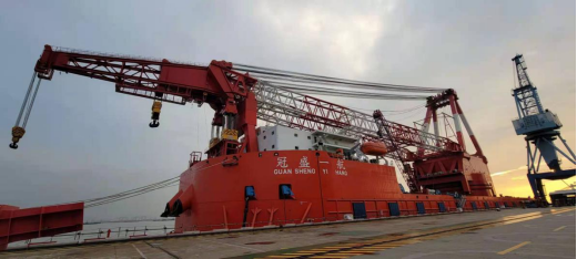 公司為天津冠盛建造的海上風電施工船,總長168.5米,最大寬度51.8米,配備4600噸全回轉起重機,最大吊高125米。主要服務于海上風電設施吊裝和打樁作業(yè),海上風電升壓站和海上油氣田大型采油模塊的吊裝作業(yè),能有效解決海上作業(yè)窗口期短的問題,極大地提高海上風電施工作業(yè)的效率,填補了國內海洋風電安裝大噸位起重機需求。