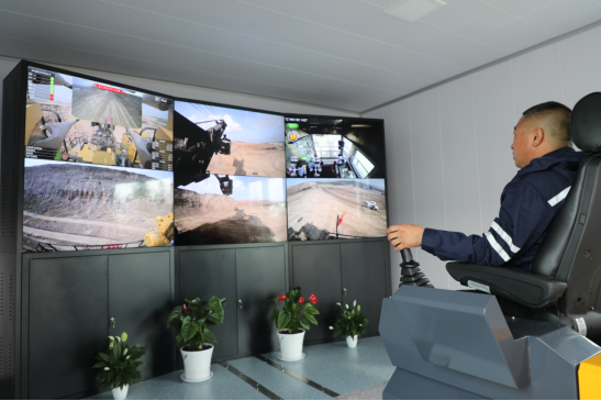 公司為霍林河南露天煤礦提供的WK-12C電鏟,配備了遠程操控智慧化解決方案。通過對現(xiàn)場畫面、聲音、振動等環(huán)境感知和模擬,用戶可以在距離現(xiàn)場10km之外的遠程操作室,對電鏟進行操作控制,全鏈路延時控制在250ms以內(nèi)。